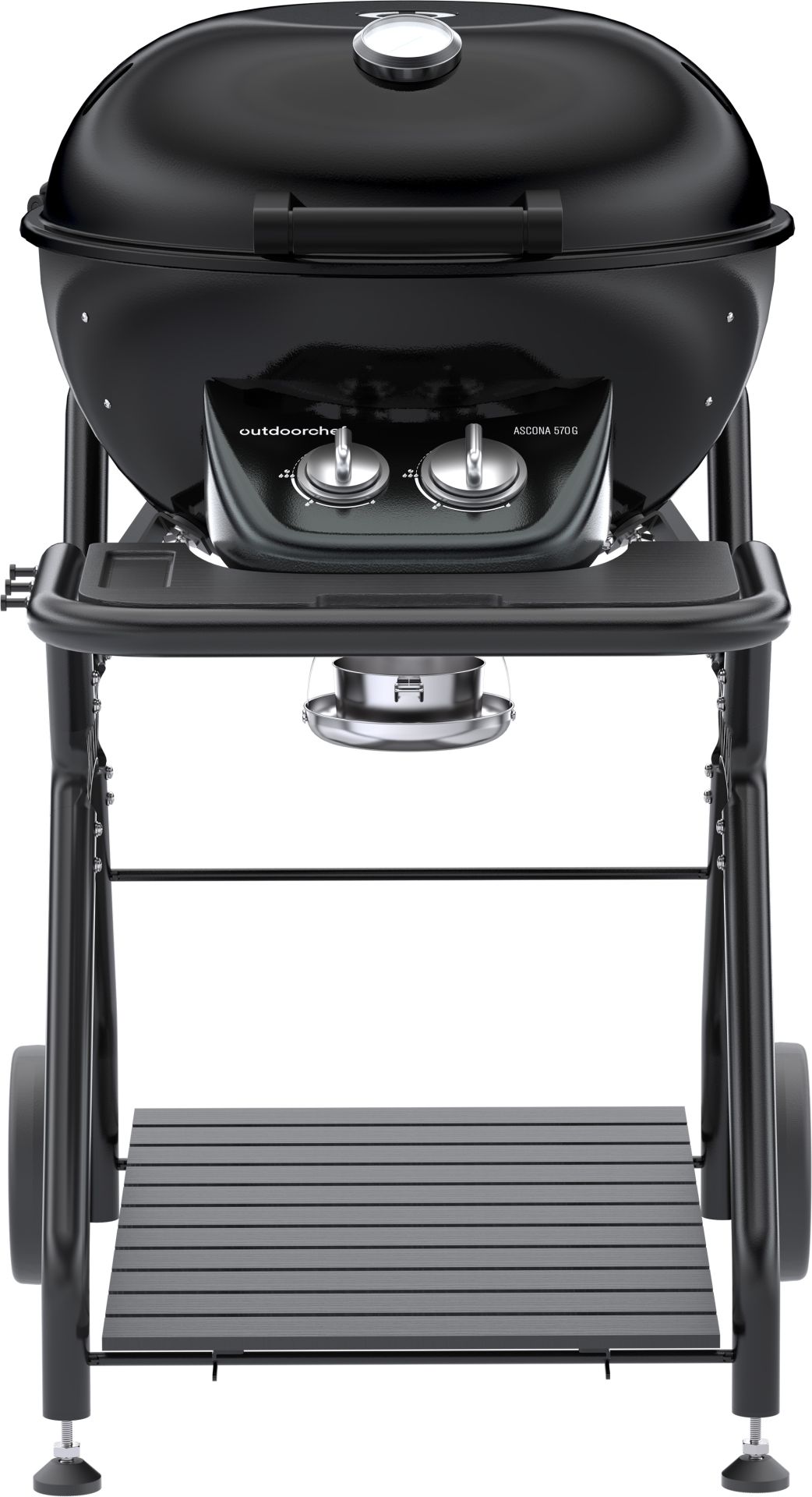 Das mobile Untergestell mit großen Laufrädern ermöglicht einen einfachen Standortwechsel, während die integrierte Gasflaschenhalterung Platz für 5 kg oder 8 kg Gasflaschen bietet. Ein praktischer Ablagetisch mit Besteckhaken sorgt zusätzlich für Ordnung und komfortables Arbeiten am Grill.