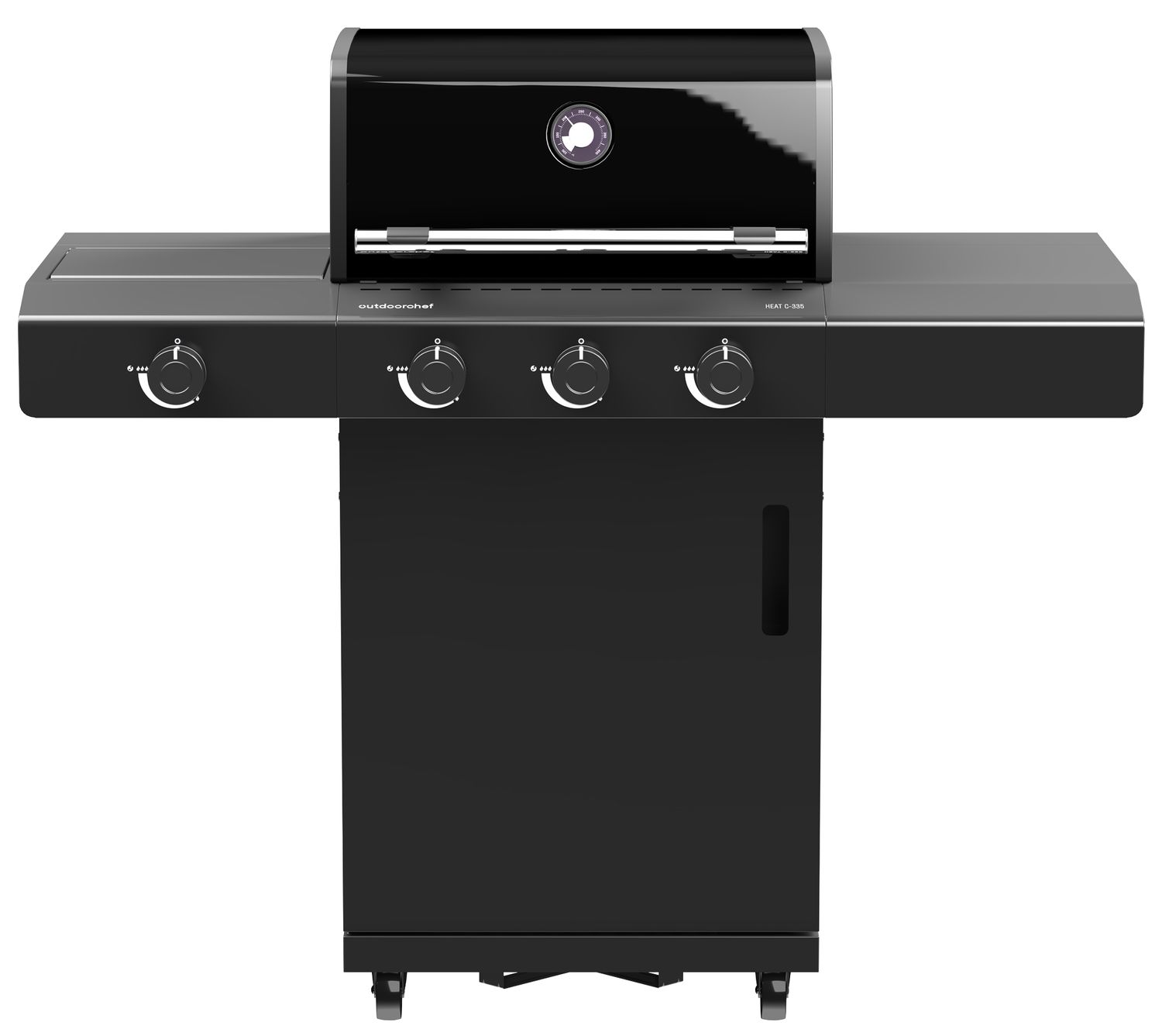 Auch in puncto Komfort überzeugt die HEAT C-335: Fest montierte Seitenablagen bieten großzügige Arbeitsflächen, während der geräumige Unterschrank Platz für Gasflaschen bis 11 kg schafft. Hochwertige Edelstahlrollen – zwei davon mit Feststellbremsen – ermöglichen ein einfaches Bewegen und sorgen für stabilen Stand. Magnetische Zubehörhalter mit Universalhalter und Hakenleiste halten Grillwerkzeuge jederzeit griffbereit.