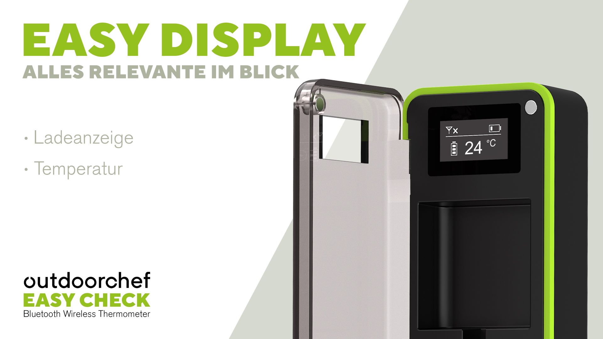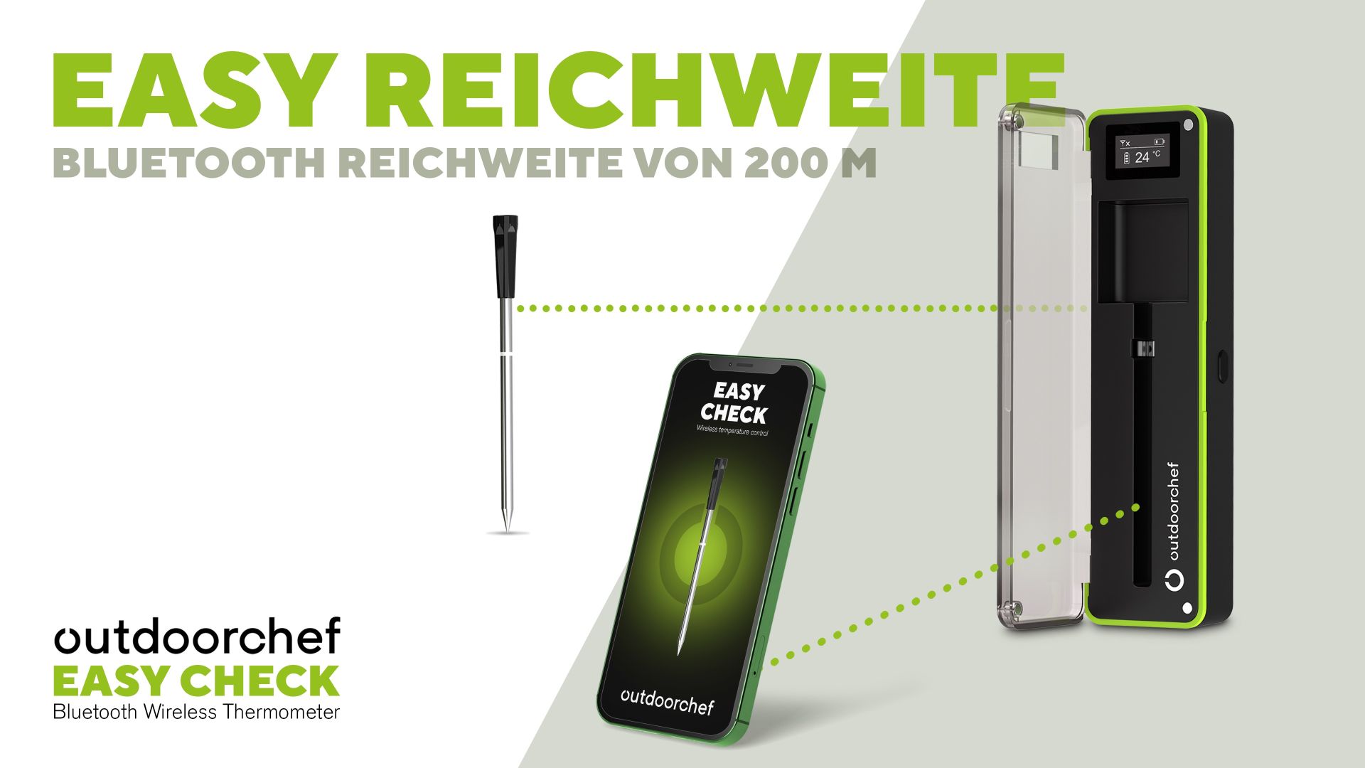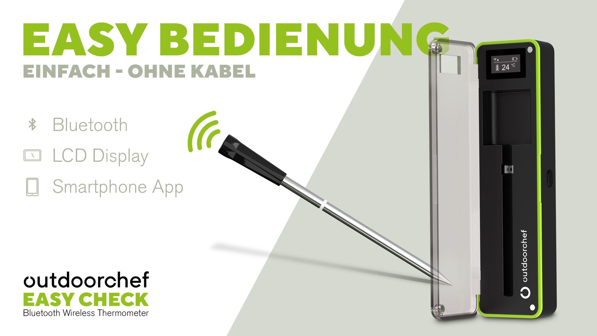 Das Outdoorchef EASY CHECK Thermometer Single ist ein kabelloses Bluetooth Grillthermometer für präzise Temperaturkontrolle und maximale Flexibilität beim Grillen. Der extra schlanke Temperaturfühler mit nur ca. 5 mm Durchmesser wird direkt im Grillgut platziert und misst gleichzeitig Kern- sowie Garraumtemperatur dank zwei integrierter Sensoren. So behalten Sie jederzeit den perfekten Gargrad im Blick.