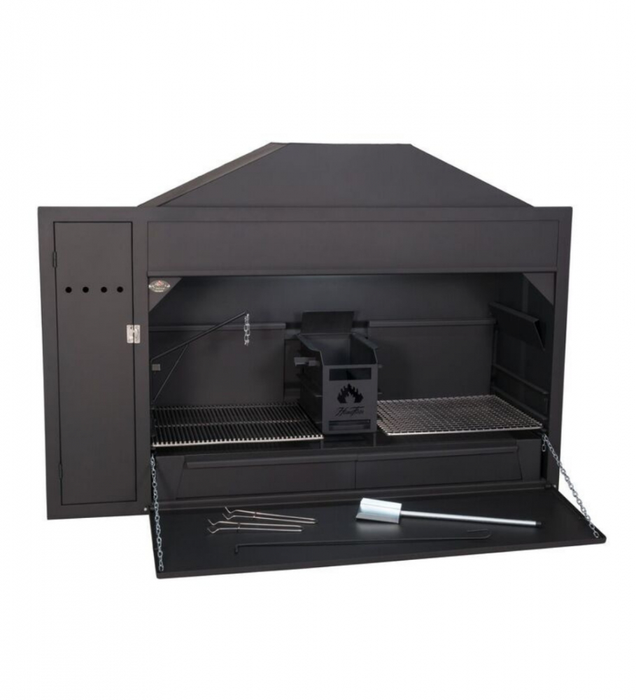 Die tiefer gebaute Grillkammer mit 150 cm Innenraum und robuster Bauweise bietet viel Platz für professionelles Grillen, Garen und Kochen. Der verschiebbare Embermaker (Kohlemacher) mit 18 mm dicken Stäben erzeugt gleichmäßige Glut aus Holz – für authentischen Braaigenuss.